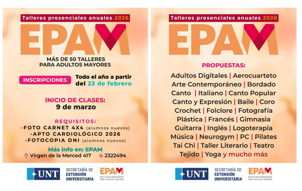 La Universidad Nacional de Tucumán, a través de la Secretaría de Extensión Universitaria, abrió la inscripción a los talleres anuales 2026 del EPAM (Educación Permanente para Adultos Mayores), una iniciativa destinada a personas mayores de 50 años.