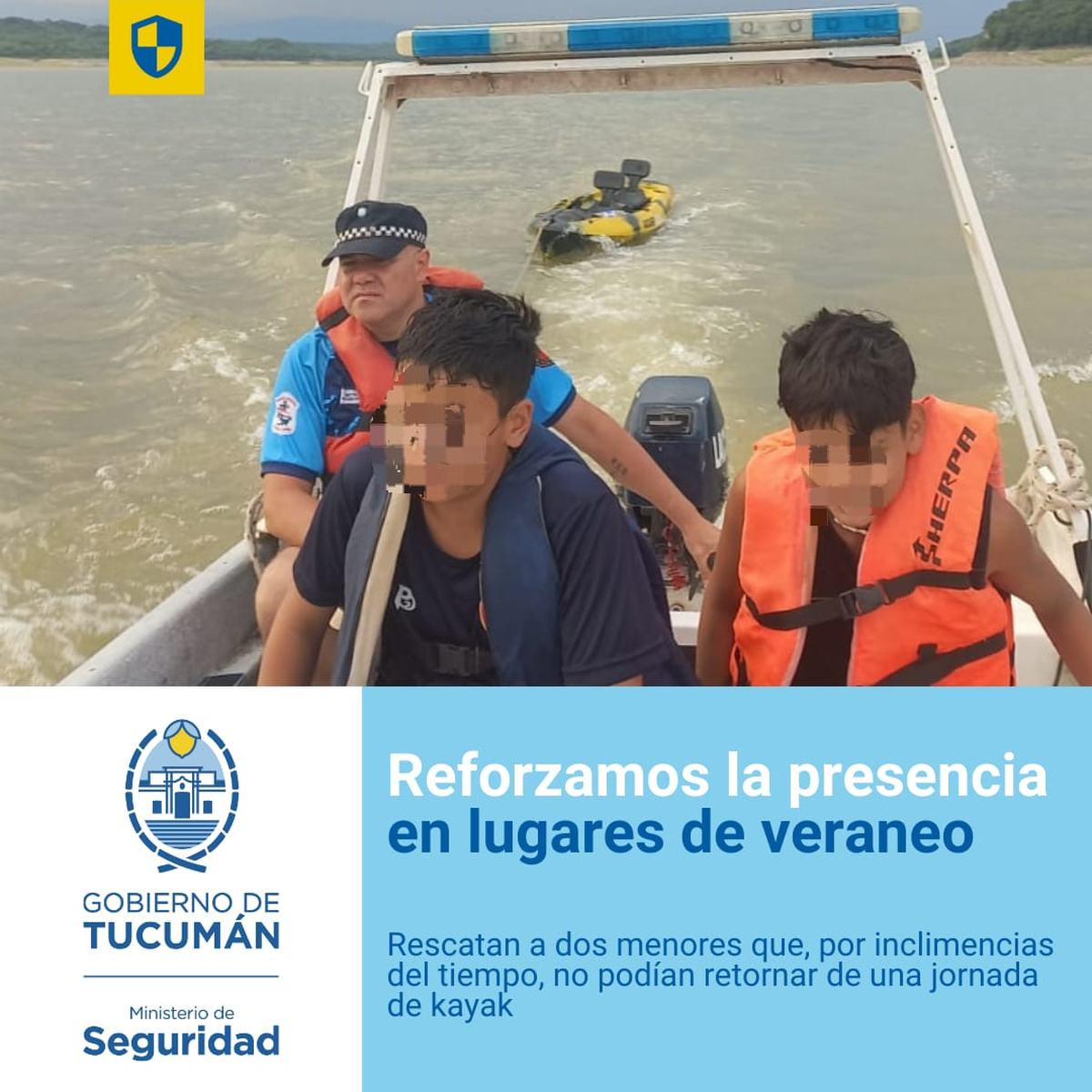 Un equipo de la División Lacustre Destacamento El Cadillal de Bomberos de la Policía de Tucumán rescató, este sábado, a dos adolescentes que estaban realizando actividades de kayak y, durante más de 4 horas, no regresaban. La madre de uno de los menores solicitó ayuda, por lo que se realizó un recorrido en el dique que permitió encontrar a los jóvenes sanos y salvos, indicando que se les dificultó regresar debido a la corriente de aire adversa.